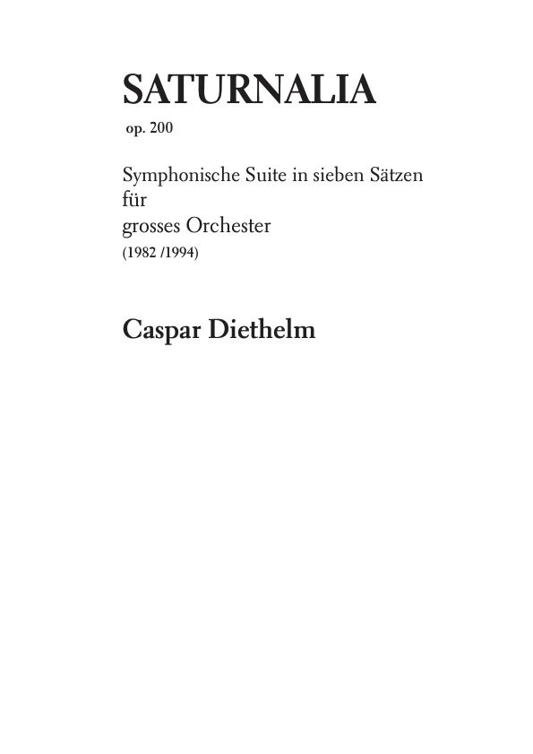 SATURNALIA Symphonische Suite für grosses Orchester in 7 Sätzen (2, Pic, 2, EH, 2, Bkl, 2, Kf / 4, 3, 3, 1 / Pk, Perc / Hf / Str) I. Allegro moderato II. Allegro vivace III. Lento IV. Allegro, quasi scherzo V. Allegro con spirito VI. Largo con espressione VII. Finale. Allegro molto vivace op. 200 1981/1982, Revision 1994 Dauer 40' Ausgabe: Partitur und Stimmen als PDF Edition: © 2016 Selbstverlag Diethelm Luzern Preis: € / CHF 200,- Link zum Bestellen Aufnahme: © 2017 Guild Music, Symphonic Works, Royal Scottish National Orchestra, Leitung: Rainer Held GM3CD7808 |